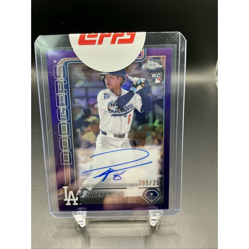 The 2025 Topps Chrome Hyeseong Kim Rookie True Purple Refractor Auto /250 is a highly sought-after sports trading card featuring an autograph from Hyeseong Kim, a player for the Los Angeles Dodgers in Major League Baseball. This card, part of the 2025 Topps Chrome set manufactured by Topps, is a limited edition parallel variety with a print run of only 250. Authenticated by Topps, this hard-signed autograph card is a valuable addition to any baseball card collection, especially for fans of rookie players like Kim.