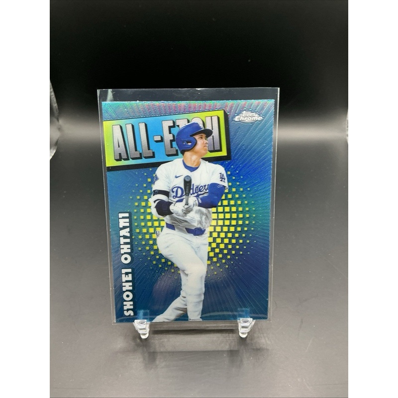 The product is a 2025 Topps Chrome trading card featuring Shohei Ohtani, part of the All-Etch insert set. This original baseball card is manufactured by Topps and showcases the player as a member of the Los Angeles Dodgers. The card is made of card stock with a thickness of 35 Pt. and is produced in the United States. This English-language trading card is a ChromeAllEtch variety, making it a valuable collectible for fans and collectors alike.