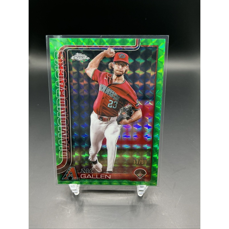 The 2025 Topps Chrome Zac Gallen Green Geometric /99 is a highly sought-after sports trading card featuring baseball player Zac Gallen from the MLB. This limited edition card is part of the Topps Chrome set manufactured by Topps for the 2025 season. With a