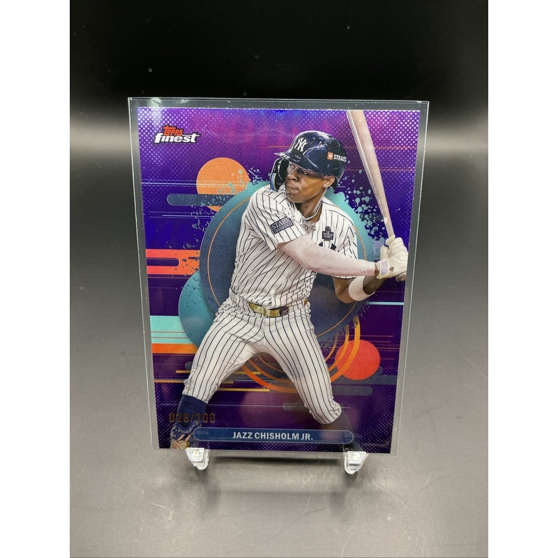 The product is a 2025 Topps Finest Jazz Chisholm Jr. SP Purple Refractor trading card featuring the player from the New York Yankees. This limited edition card has a print run of only 200 and is an original release by Topps. The card is made of high-qualit