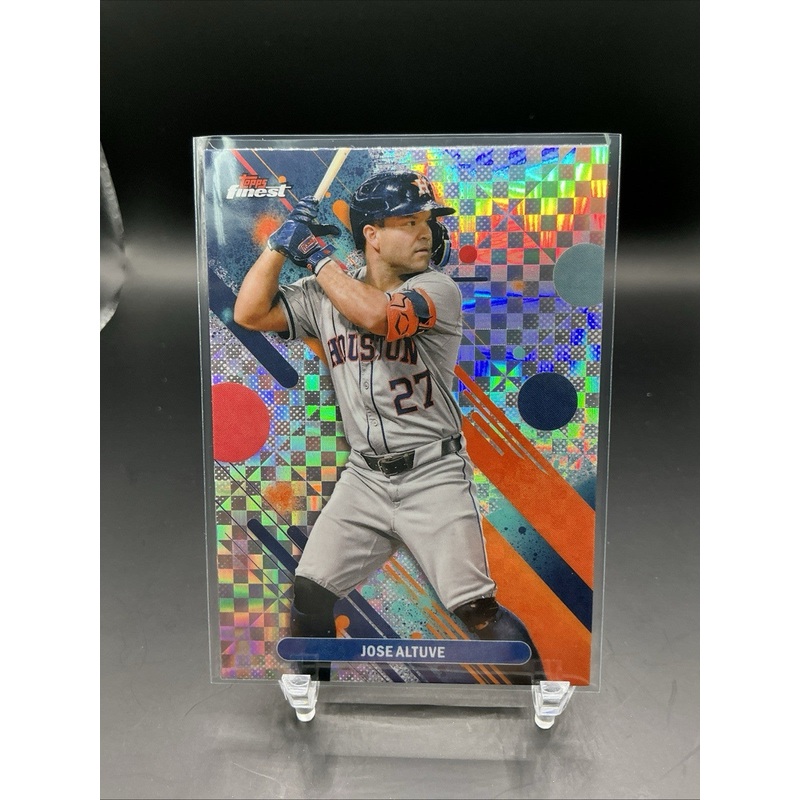 The product is a 2025 Topps Finest Common Jose Altuve Checker Board Houston Astros trading card. This card features Jose Altuve, a player from the Houston Astros, in Major League Baseball. The card is made of standard card stock with a thickness of 20 Pt. It is an original release by Topps, a well-known manufacturer of sports trading cards. The card is part of the 2025 Topps Finest set and belongs to the Houston Astros franchise, making it a desirable item for baseball fans and card collectors.