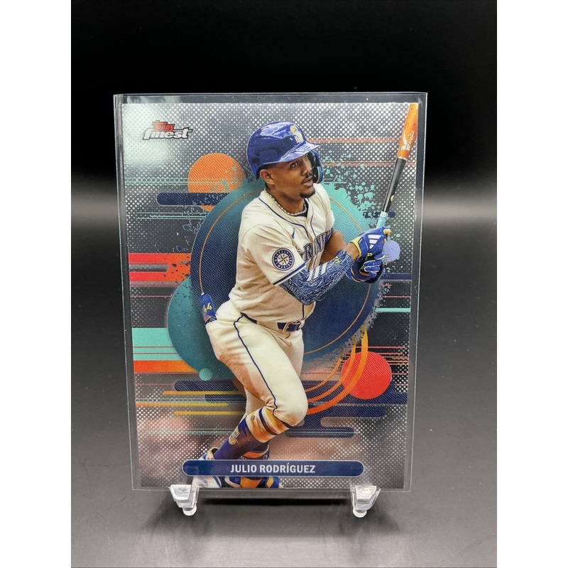 The product is a 2025 Topps Finest trading card featuring Julio Rodriguez, a player from the Seattle Mariners, in an Uncommon Refractor parallel variety. This baseball card is part of the Major League (MLB) set and is a Short Print with a card number of 110. It is a collectible item manufactured by Topps, perfect for fans and collectors looking to add a unique piece to their collection from the 2025 season.