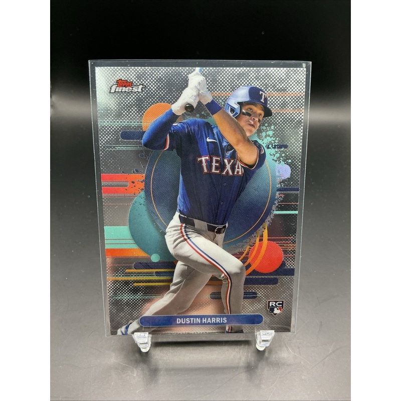 The product is a 2025 Topps Finest baseball trading card featuring Dustin Harris of the Texas Rangers. This card is an uncommon rookie card, part of a short print set that includes parallel varieties. Manufactured by Topps, it is numbered 127 from the 2025 season and is a highly sought-after collectible for fans and collectors of baseball trading cards.