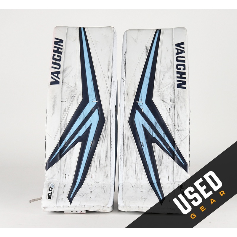 These pads are lightly used. Floor to Knee Measurement: 18 inches Knee to Top Measurement: 11 inches Brand Vaughn SKU: UPC: Team Nashville Predators Player Troy Grosenick Primary Color White Model SLR4 Size 35" Length Adjustment 0