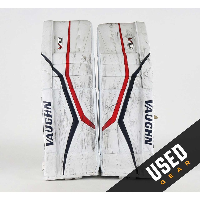 These pads are used. Floor to Knee Measurement: 19 inches Knee to Top Measurement: 12 inches Brand Vaughn SKU: UPC: Team Columbus Blue Jackets Player Daniil Tarasov Primary Color White Model Velocity V10 Size 36" Length Adjustment 0