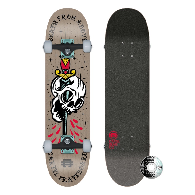 GREY SKATEBOARD COMPLETEAn american traditional tatoo meaning youre ready to face anything without fear.DECK:7 Ply Canadian MapleDouble Kick TailBlack GripPROHIBITION TRUCKS:5Hanger (only for 7.5)5.25 Hanger (on 7.8 & 8)Aluminium / SteelUS Bushings (Black)