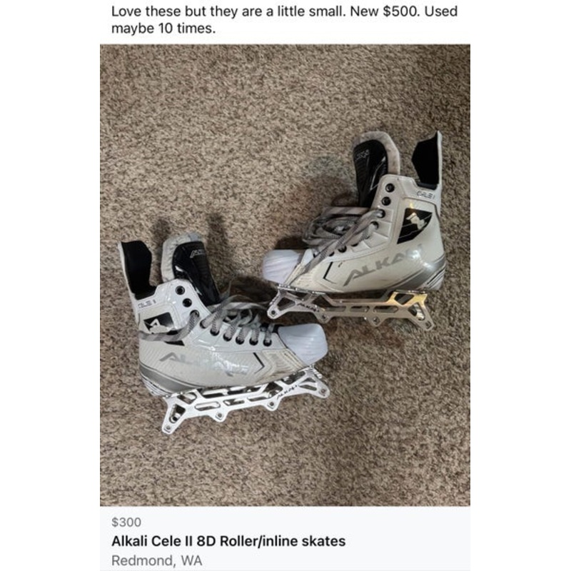 SpecificationsCategoryInline, Roller & Street Hockey > Inline SkatesBrandAlkaliSkate Width D&R (Regular)Age Group SeniorSkate Size 8.0Condition UsedQuantity1 available|||Seller DescriptionNew $500. Used under 10 times, just a little too small fo