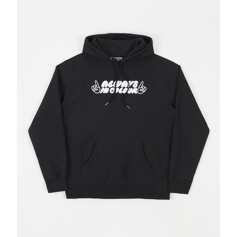 Always in Colour Hands Hoodie in Black. Tailored to a classic fitting inspired by its sportswear muse, this70% ringspun cotton 30% polyester Always in Colour hoodie arrives as part of the brands latest seasonal release. With a heavyweight construction thats designed to provide ample insulative coverage regardless of season, this hoodie features cuffed sleeves, an elasticated hemline and cross-grain body panels for added reinforcement. A dual entry kangaroo pocket above the waist supplies ample stash space to suit, with the colour matched drawcord trims across the hooded neckline providing additional stylability to suit. Signed off with crisp white printed Always in Colour bubble branding across the upper chest with pointed finger decals displayed either side.