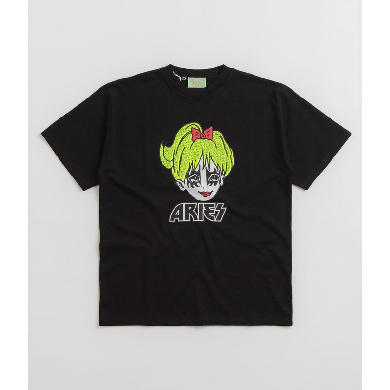 Aries Kiss T-Shirt in Black. Tailored to a unisex fitting and crafted from 100% cotton jersey, this Aries t-shirt is designed with a flexible rib knit collar and a straight cut hem. Finished in a shade of black with a printed Aries chest graphic.