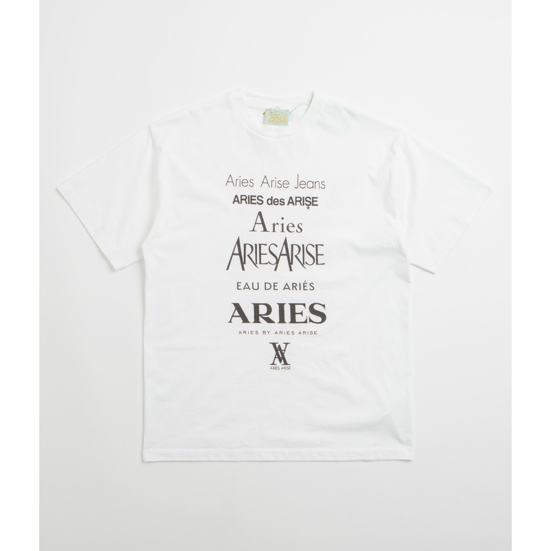 Aries Perfume T-Shirt in White. Crafted from 100% cotton, this block tone Aries t-shirt is designed with a classic crew collar and a straight cut hem. Finished in a shade of white, this unisex Aries t-shirt also features a printed centre chest graphic.
