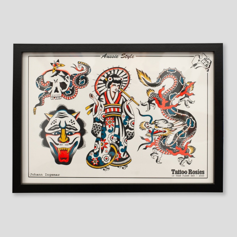 Celebrating a decade of tattooing in Sydney. A multidisciplinary art show featuring work from the whole team with pieces from the past, present, and in between.Title:Aussie style"Medium: Framed 1/1Shipping is available for artworks but will be arranged sep