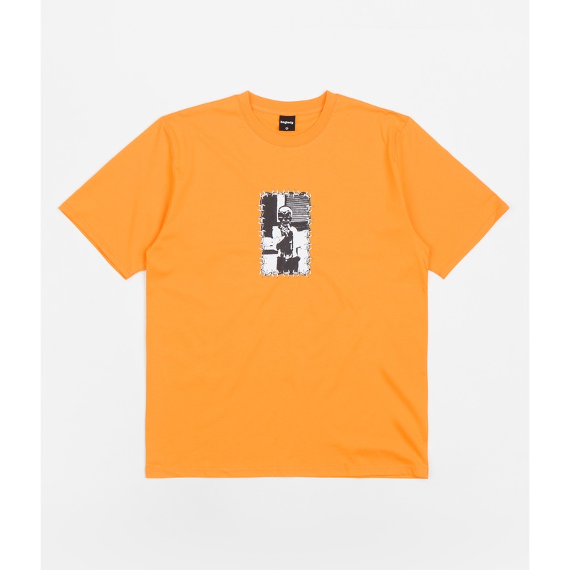Baglady Skull Crusher T-Shirt in Tangerine. Seen here in a colour block shade, this boxy fitting Baglady t-shirt is made from 100% cotton. Featuring a classic crew collar and a straight cut hem, this orange t-shirt is finished with a Skull Crusher centre chest print and with additional baglady branding printed beneath the neckline on the reverse.