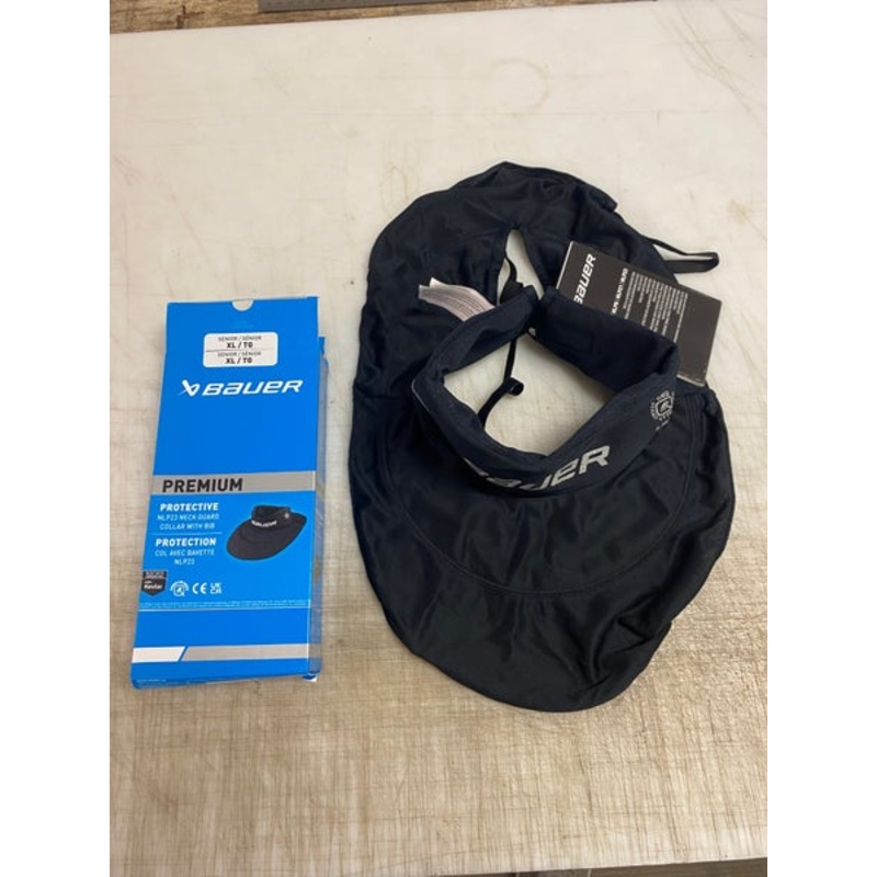 SpecificationsCategoryHockey > Protective > Neck Guards, Wrist Guards, Padded Shirts & OtherBrandBauerCondition NewAge Group SeniorColor BlackVariationsAvailableLarge17XL2|||Seller DescriptionBauer Hockey Neck Guard with Bib A3 Kevlar Cut Resista