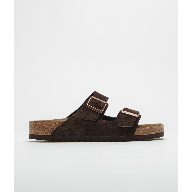DescriptionBirkenstock Arizona SandalsBirkenstock Arizona Sandals in Mocha. Designed with suede leather uppers, this anatomically shaped Birkenstock Arizona features a double-buckle fastening and a soft suede lining. Finished in dark brown with a contoured