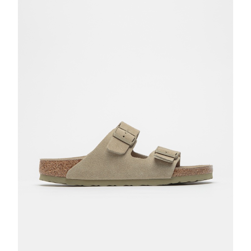 Birkenstock Arizona SFB Narrow Sandals in Faded Khaki. Narrow fitting with a soft suede footbed, this Birkenstock Arizona is designed with a suede leather upper. Featuring a double-buckle fastening with traverse arch support and a deep heel cup, this khaki Birkenstock sandal is finished with an EVA sole and printed branding.