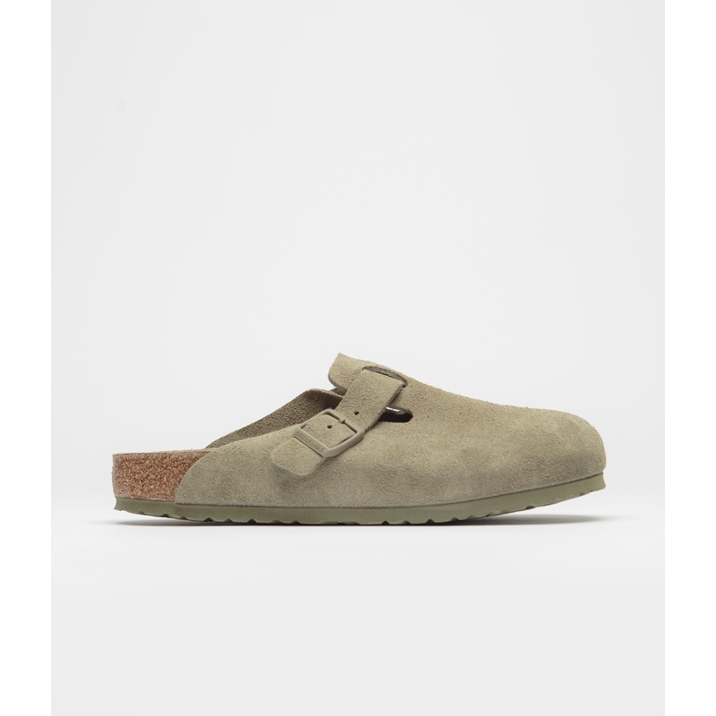 Birkenstock Boston BS Clogs in Faded Khaki. Designed with a napped finish, this Birkenstock sandal is styled with suede uppers and a suede lining. Featuring an anatomically shaped cork-latex footbed and a cushioned EVA sole, this khaki Birkenstock Boston sandal is finished with a single strap fastening, a tonal Birkenstock buckle and with a natural leather insole.