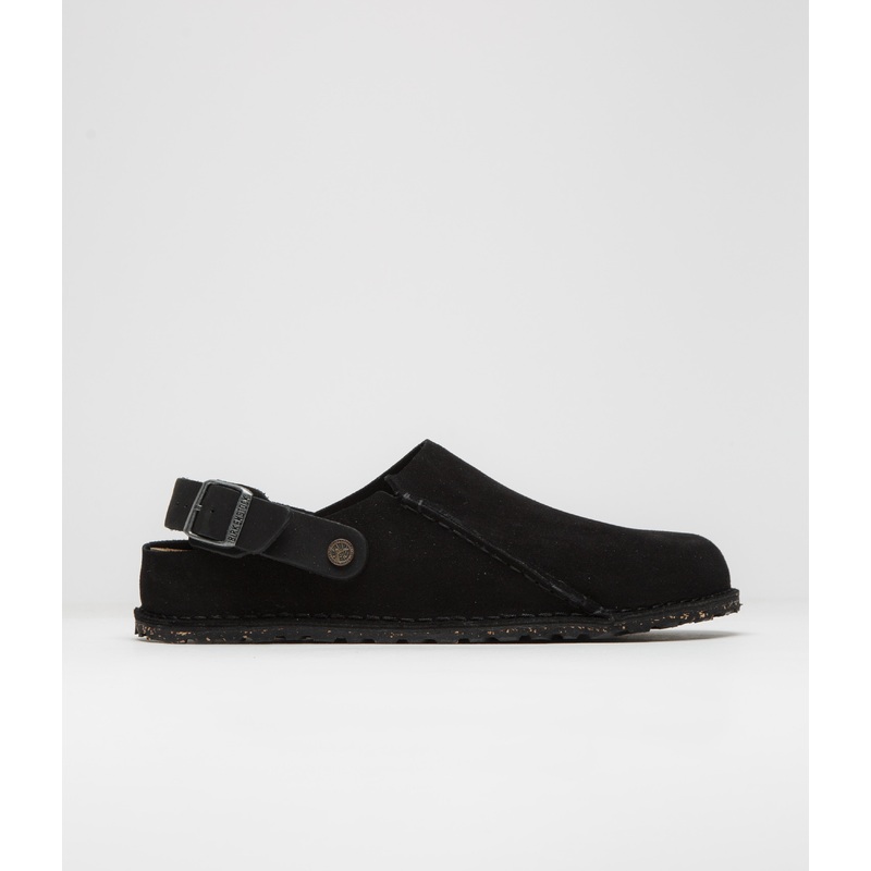 DescriptionBirkenstock Lutry Narrow Premium Suede SandalsBirkenstock Lutry Narrow Premium Suede Sandals in Black. Styled with a narrow fit and anatomically shaped, this Birkenstock sandal is designed with a suede upper and a cork-latex footbed. Featuring a
