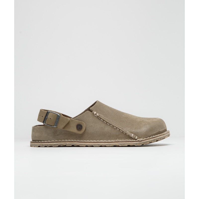 DescriptionBirkenstock Lutry Premium Suede SandalsBirkenstock Lutry Premium Suede Sandals in Grey Taupe. Crafted in Germany with a suede upper, this anatomically shaped Birkenstock sandal is styled with a cork-latex footbed. Featuring a deep heel cup, an E