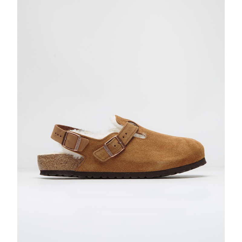 DescriptionBirkenstock Tokio Shearling SandalsBirkenstock Tokio Shearling Sandals in Mink. Designed with a Shearling lining and a nubuck leather rear strap, this Birkenstock Tokio is styled with a closed-toe suede upper. Featuring an anatomically shaped fo