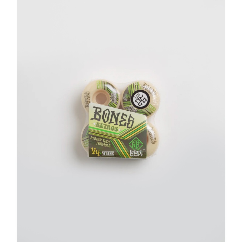 Bones STF Retros 99A V4 Wide Wheels in 52mm. Made from 100% performance urethane with a width of 34mm, these Bones wheels are available as a pack of four. Featuring a 52mm diameter and a 34mm width, these Bones Street Formula wheels are V4 shaped and designed with a 99A durometer.
