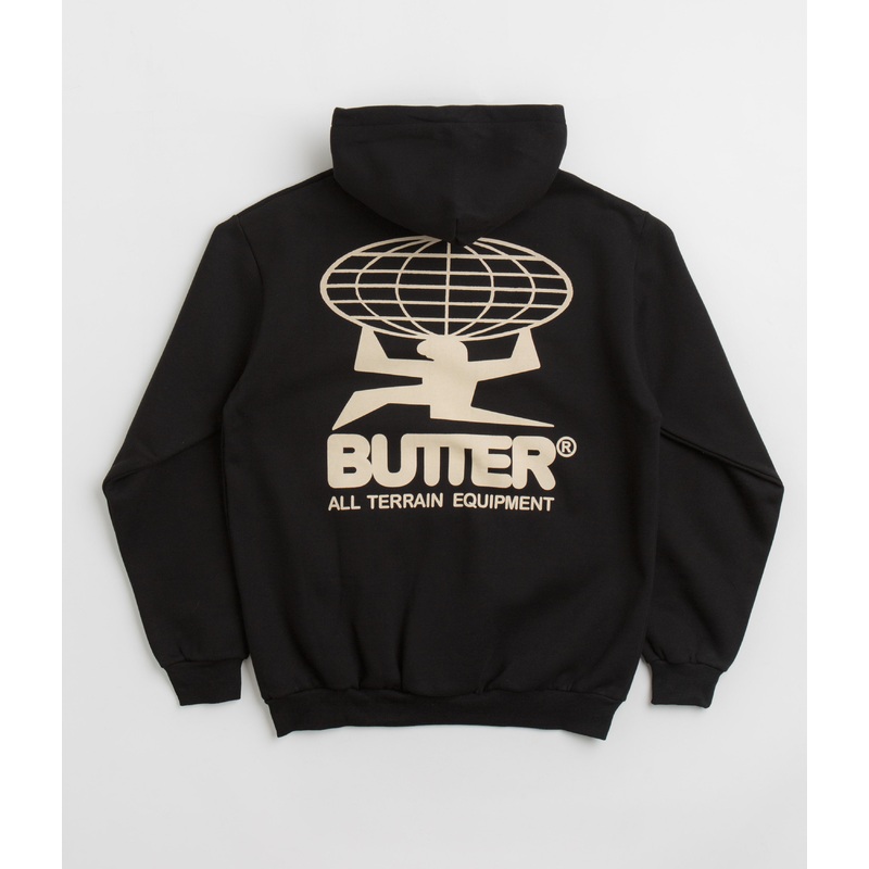 DescriptionButter Goods All Terrain HoodieButter Goods All Terrain Hoodie in Black and Peach. Regular fitting and made from a heavyweight cotton-polyester blend, this Butter Goods hoodie is styled with dropped shoulders and a split panel hood. Featuring ri
