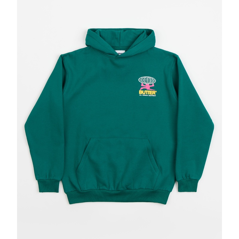 Butter Goods All Terrain Hoodie in Pine. Made from a heavyweight cotton-polyester blend, this regular fitting Butter Goods hoodie is styled with a split panel hood and dropped shoulders. Featuring rib knit cuffs, a woven elastic hemline and a classic kangaroo pouch pocket, this pine green hoodie is finished with printed Butter All Terrain Equipment branding displayed across both the left chest and reverse.