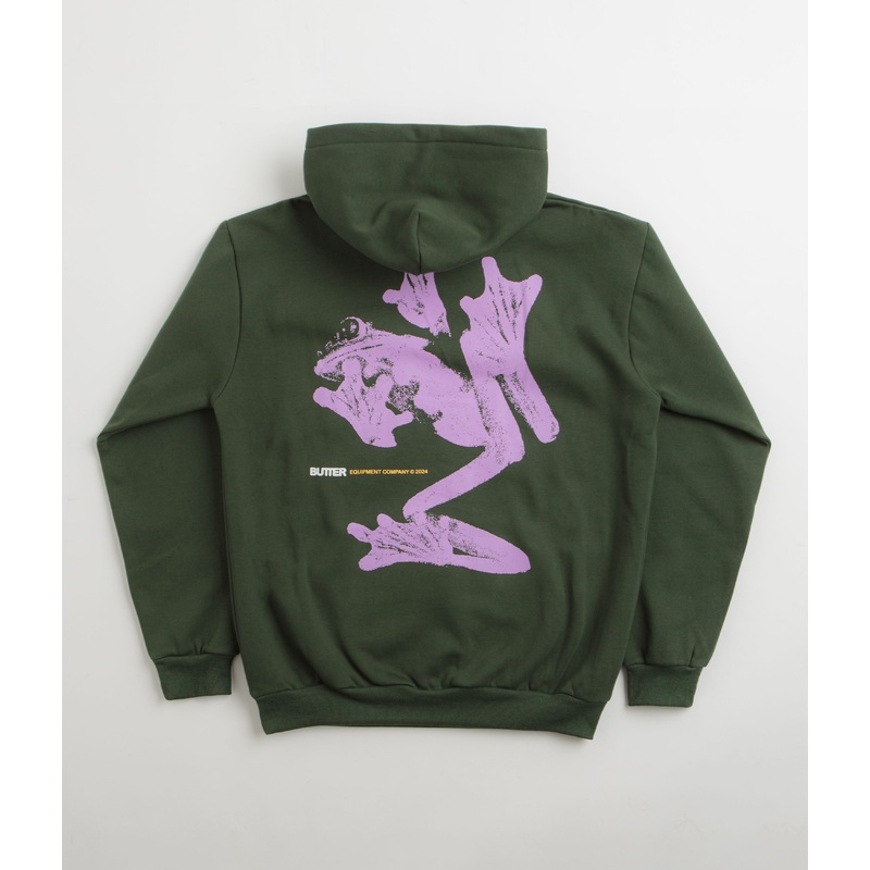 Butter Goods Amphibian Hoodie in Dark Green. Regular fitting and made from a heavyweight cotton-polyester blend, this new season Butter Goods hoodie is styled with a split panel hood and dropped shoulders. Finished in a shade of dark green with ribbed cuffs, a woven elastic hem, a kangaroo front pocket and with screen printed front and rear graphics.
