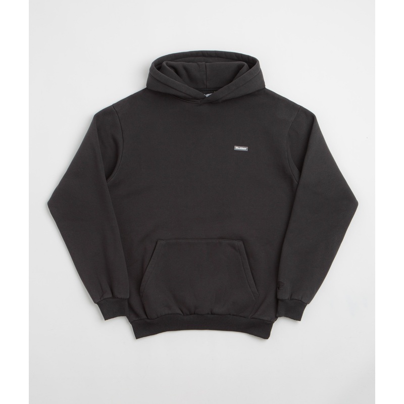 Butter Goods Basic Hoodie in Black. Made from a heavyweight cotton-polyester blend, this block tone Butter Goods hoodie is styled with a mineral washed construction. Featuring a split panel hood, dropped shoulders and ribbed cuffs, this black Butter Goods hoodie is finished with a kangaroo front pocket, a rubber left chest patch and with embroidered cuff logo detailing.
