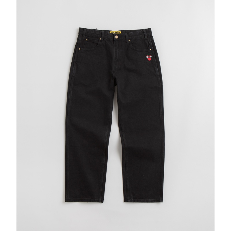 Butter Goods Big Apple Jeans in Washed Black. Arriving as part of the brands latest release, these Butter Goods jeans are made from 100% cotton with a belt loop waist and a single button secured zipper fly. Tailored to a relaxed fitting with a tapered leg, these black Butter Goods jeans are finished with four classic pockets, a single coin pocket, a woven PU rear belt patch and with embroidered logo detailing.