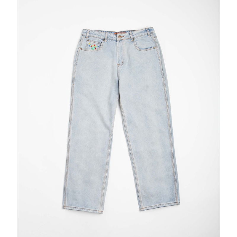 Butter Goods Bouquet Jeans in Light Blue. Tailored to a relaxed fitting with a straight leg cut, these Butter Goods jeans are made from 100% cotton denim with contrast stitching. Featuring a drawstring waistband, a single button secured YKK zipper fly, two front pockets, two rear pockets and an embroidered coin stash, these light blue Butter Goods jeans are finished with an exposed rear yoke and an embroidered PU belt patch.