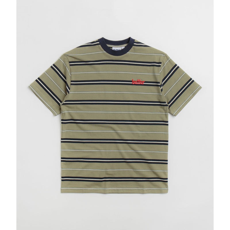 DescriptionButter Goods Bryce Striped T-ShirtButter Goods Bryce Striped T-Shirt in Sage. Designed with an all-over stripe and a contrasting rib knit collar, this Butter Goods t-shirt is made from 100% cotton. Tailored to a regular fitting with a reinforced