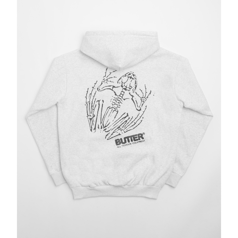 Butter Goods Fossil Hoodie in Ash. Made from a heavyweight cotton-polyester blend, this block tone Butter Goods hoodie is designed with a split panel hood. Finished in grey with a kangaroo front pocket, ribbed cuffs and printed front and rear graphics.