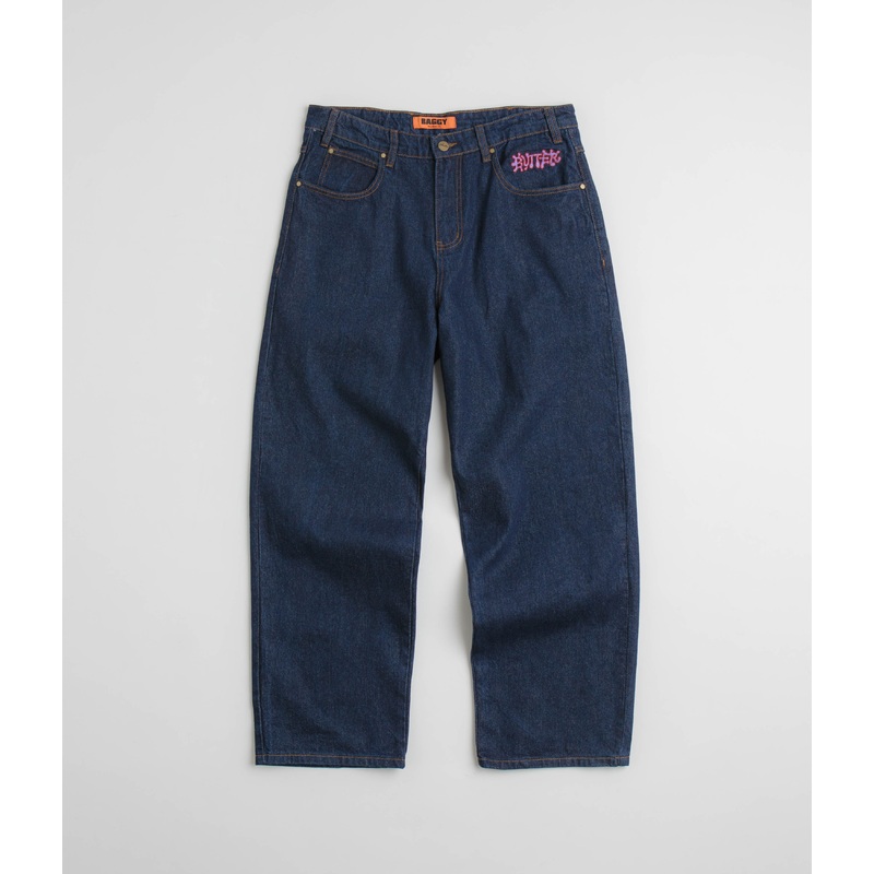 Butter Goods Ink Jeans in Raw Indigo. Made from 100% cotton denim, these baggy fitting Butter Goods jeans are designed with distressed knees and a straight leg cut. Featuring a single button secured zipper fly and four classic pockets, these dark indigo Butter Goods jeans are finished with direct embroidery, 3D embroidered logos and with a woven rear PU waist patch.
