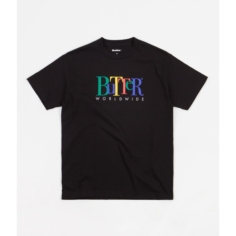 Butter Goods Jumble T-Shirt in Black. A bold black tee from the brands latest seasonal instalment, this 100% cotton Butter Goods t-shirt is a 6oz silhouette thats tailored to a relaxed fitting for elevated everyday comfort. A casual crew collar, trimmed seams and a reinforced hemline combine for increased structural support, whilst the multi tonal Butter Worldwide centre chest branding pays homage to throwback 90s era corporate branding through its signature design.
