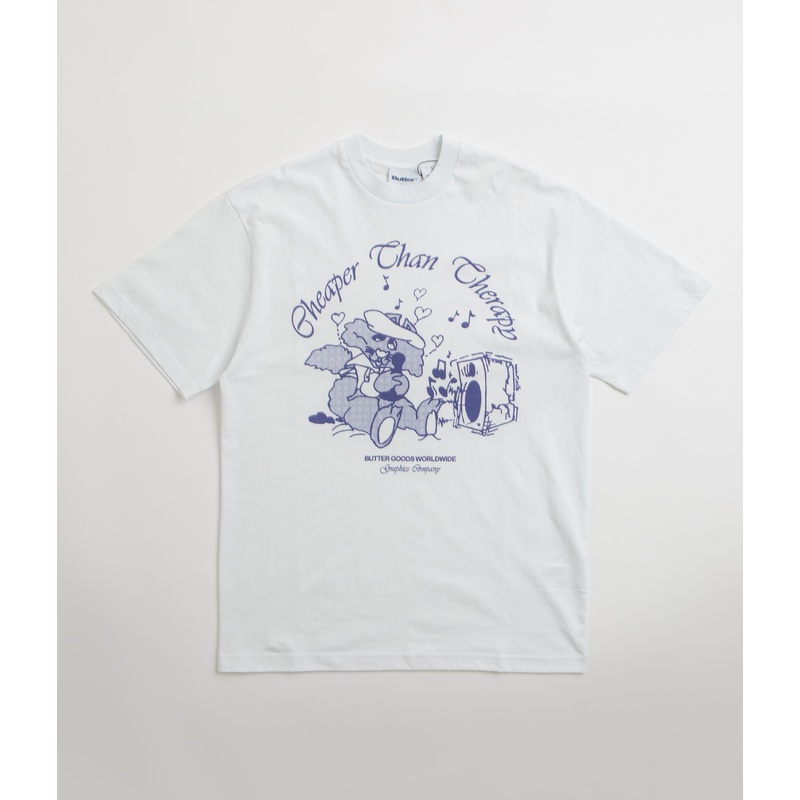 Butter Goods Karaoke T-Shirt in White. Made from 100% cotton, this colour block Butter Goods t-shirt is tailored to a regular fitting. Featuring a rib knit crew collar and a straight cut hem, this white Butter Goods t-shirt is finished with a screen printed centre chest graphic.