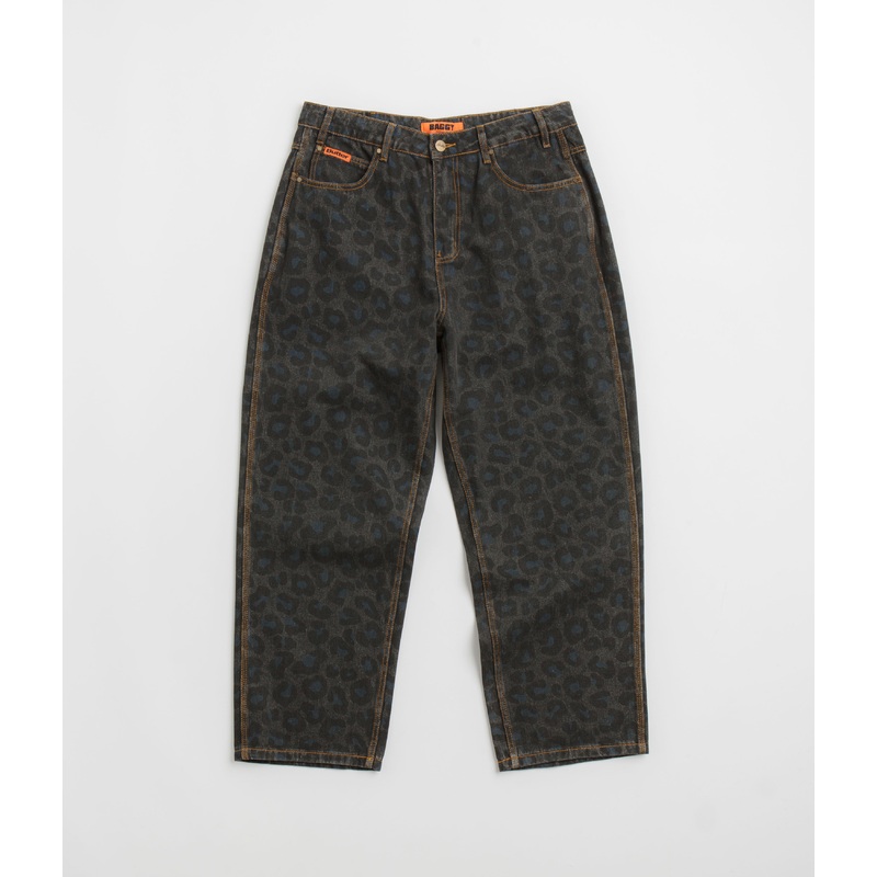 Butter Goods Leopard Jeans in Black. Designed with an all-over leopard print pattern, these baggy fitting Butter Goods jeans are made from 100% cotton denim. Featuring a belt loop waistband and a single button secured zipper fly, these black Butter Goods jeans are finished with two front pockets, two rear pockets, a single coin pocket and with a woven rear belt patch.