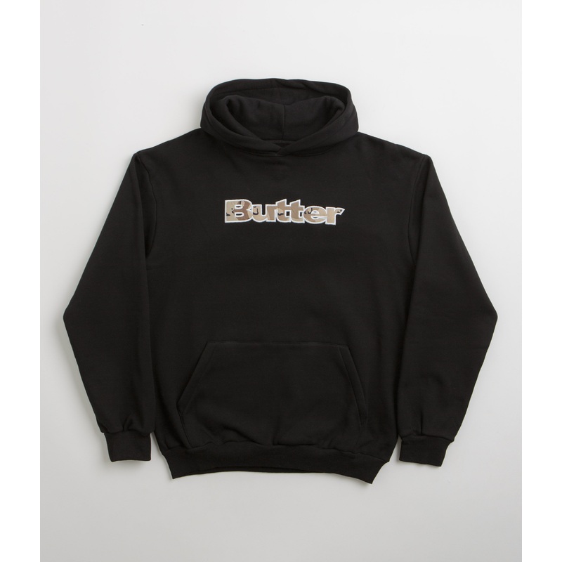 DescriptionButter Goods Logo Camo Applique HoodieButter Goods Logo Camo Applique Hoodie in Black. Regular fitting and made from a heavyweight cotton-polyester blend, this colour block Butter Goods hoodie is styled with a split panel hood and dropped should