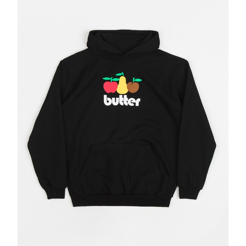 Butter Goods Orchard Hoodie in Black. Fleece lined and styled with dropped shoulders, this long sleeve Butter Goods hoodie is tailored to a regular fitting with a heavyweight construction. Featuring cuffed sleeves, a split panel hood and a woven elastic hemline, this black Butter hoodie also features a dual entry kangaroo pocket. Finished with printed Butter chest branding beneath three orchard fruits.