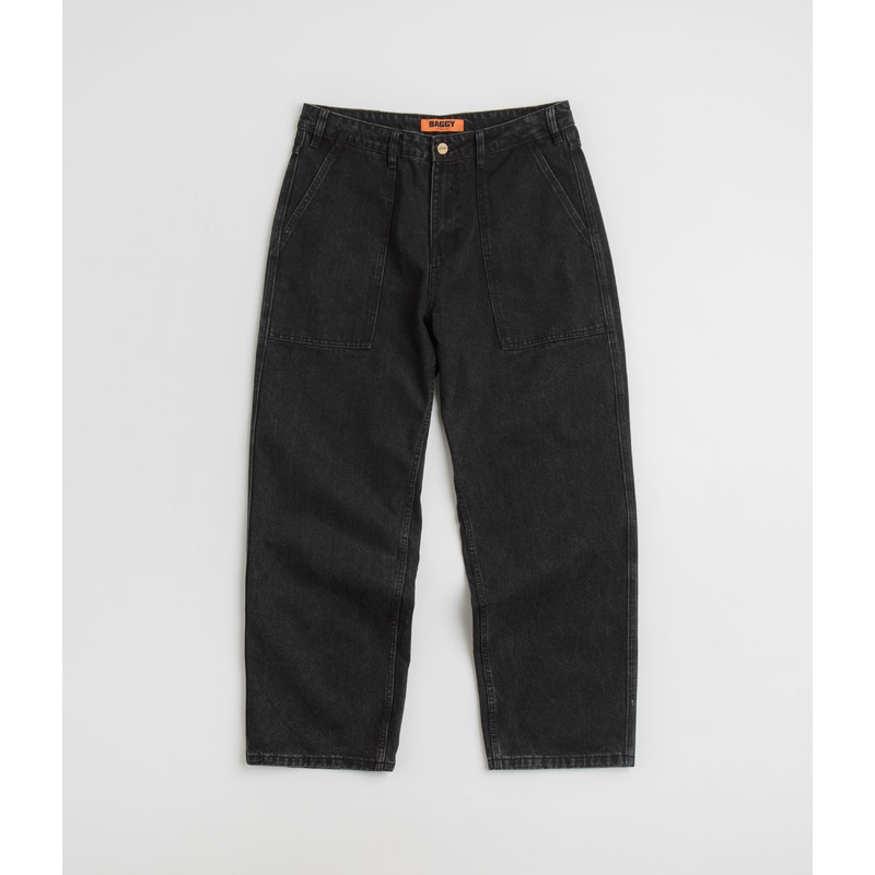 Butter Goods Patch Pocket Jeans in Washed Black. Tailored to a baggy fitting with a straight leg cut, these Butter Goods jeans are made from 100% cotton denim. Featuring a belt loop waistband, an adjustable drawstring fastening and a single button secured zipper fly, these washed black Butter Goods jeans are finished with four patch pockets and with a woven rear flag label.