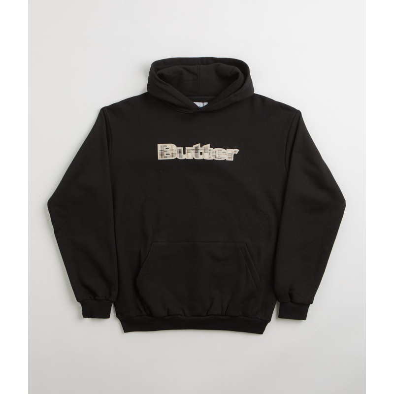 Butter Goods Plaid Applique Hoodie in Black and White. Made from a cotton-polyester blend, this regular fitting Butter Goods hoodie is designed with a heavyweight construction. Featuring a split panel hood and dropped shoulders, this black Butter Goods hoodie is finished with ribbed cuffs, a kangaroo front pocket and with a plaid applique chest graphic.