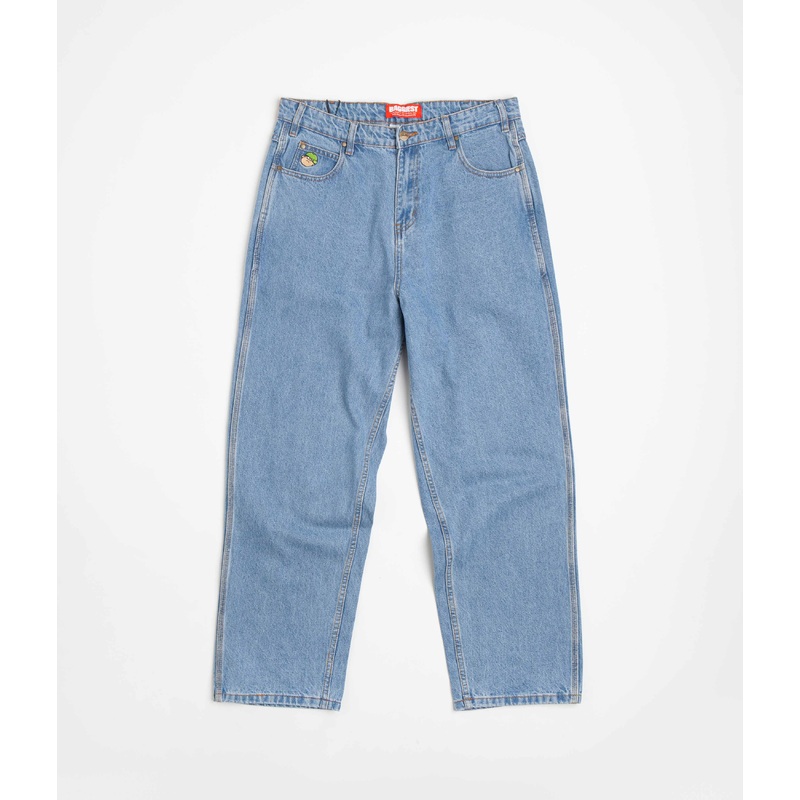 Butter Goods Santosuosso Denim Pants in Washed Blue. Tailored to an ultra baggy fitting from 100% cotton denim, these Butter Goods pants are styled with a slightly tapered cut with two leg lengths. Featuring a belt loop waist, an internal drawstring, a YKK zipper fly and contrast stitching, these washed blue Butter Goods pants are finished with four classic pockets, an embroidered character coin pocket, an exposed rear yoke and with an embroidered PU belt patch.