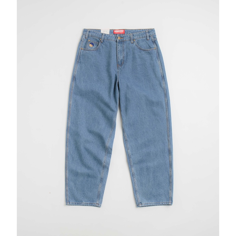 Butter Goods Santosuosso Denim Pants in Washed Indigo. Made from 100% cotton denim and tailored to an ultra baggy fit, these Butter Goods Santosuosso denim pants are inspired by the team riders signature fit. Featuring a belt loop waistband, an internal drawstring fastening and a single button secured YKK zipper fly, these tapered leg Butter Goods pants also feature contrasting stitching and a PU belt patch. Finished with two front pockets, two rear patch pockets, an embroidered Philly coin stash pocket and with additional flag label branding across the rear.