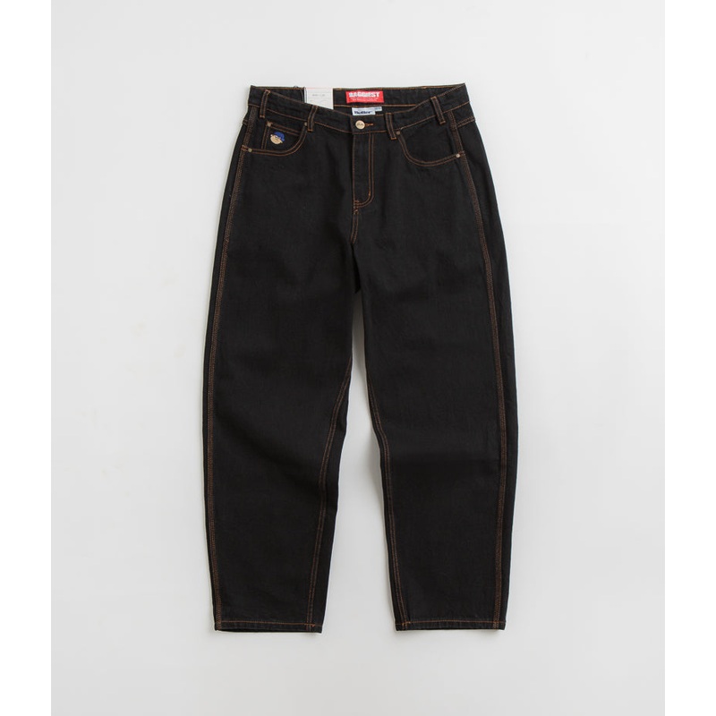 Butter Goods Santosuosso Jeans in Washed Black and Blue. Tailored to an ultra baggy fitting, these Butter Goods jeans are made from 100% cotton with contrast stitching. Featuring a classic belt loop waist with an internal drawstring, single button secured zipper fly and two adjustable leg lengths, these washed black Butter Goods jeans are finished with two front pockets, two rear pockets, an embroidered Philly coin pocket and with a woven PU belt patch.