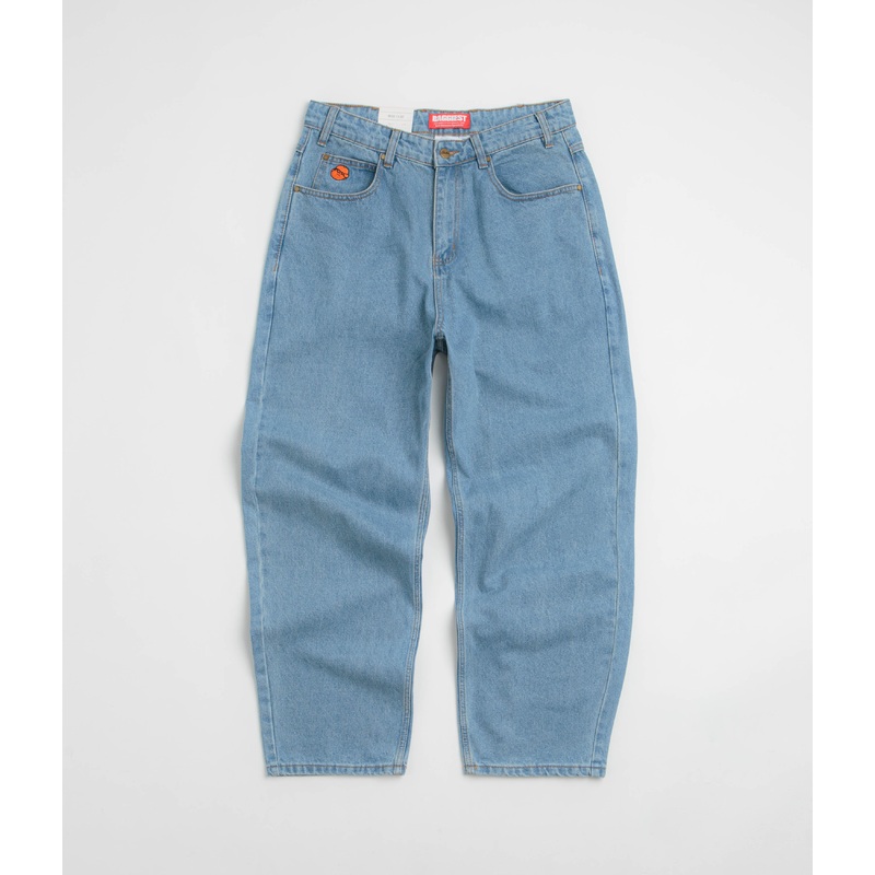 Cut wide with a slight taper, these Butter Goods jeans land that ultra baggy fit without losing shape. Made from washed blue 100% cotton denim, theyve got all the essentials – belt loops, a zip fly and four classic pockets – plus an embroidered Philly coin pocket and the option of two leg lengths. Finished with a woven flag label for a clean Butter touch.