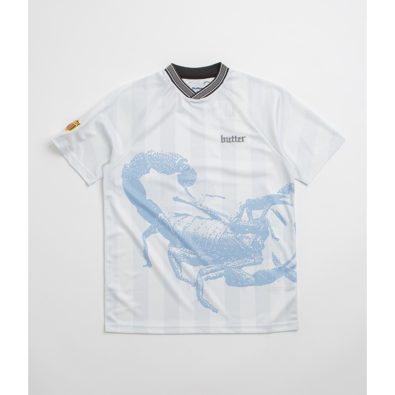 Butter Goods Scorpion Jersey in White. Regular fitting and made from 100% polyester jersey, this Butter Goods jersey is designed with a jacquard stripe collar and raglan sleeves. Finished in white with embroidered logos and digital print details.