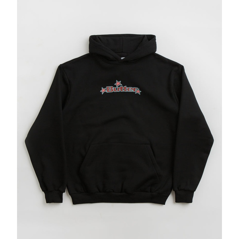 Butter Goods Star Logo Hoodie in Black. Tailored to a regular fitting from a heavyweight cotton-polyester blend, this Butter Goods hoodie is designed with a split panel hood and dropped shoulders. Featuring rib knit cuffs and a woven elastic hem, this black Butter Goods hoodie is finished with a kangaroo front pocket with a screen printed chest graphic.