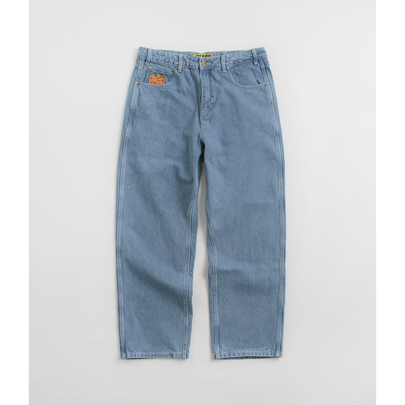 Butter Goods Tour Jeans in Washed Indigo. Tailored to a relaxed fitting with a straight leg cut, these Butter Goods jeans are made from 100% cotton denim with contrast stitch seams. Featuring a belt loop waistband, an inner drawstring and a single button secured zipper fly, these washed blue Butter Goods jeans are finished with four classic pockets, an embroidered coin pocket, a PU belt patch and with an embroidered rear Butter patch graphic.
