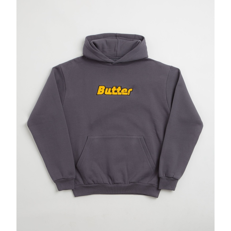 DescriptionButter Goods Transit HoodieButter Goods Transit Hoodie in Lead Blue. Regular fitting, this block tone Butter Goods hoodie is made from a cotton-polyester blend. Featuring a split panel hood, ribbed cuffs and a kangaroo front pocket, this blue Bu