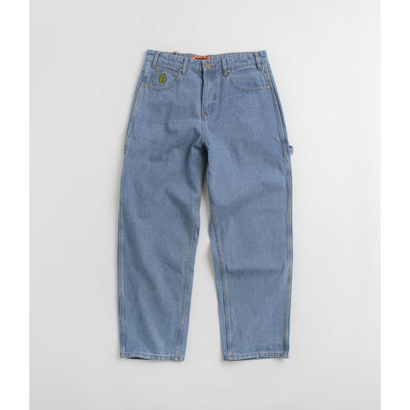 Butter Goods Weathergear Heavyweight Jeans in Washed Indigo. Tailored to a baggy fitting, these Butter Goods jeans are made from 100% heavyweight cotton. Featuring a belt loop waistband, a single button secured zipper fly and a woven hammer loop, these washed blue Butter Goods jeans are finished with four classic pockets, an embroidered coin pocket, additional utility pockets and with a rubber rear PU belt patch.