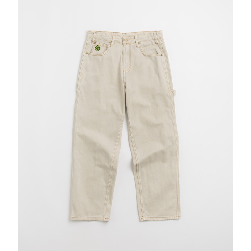 Butter Goods Weathergear Heavyweight Jeans in Washed Khaki. Baggy fitting and made from 100% cotton denim, these heavyweight Butter Goods jeans are designed with a belt loop waistband and a zipper fly. Featuring a woven hammer loop and additional utility pockets, these washed khaki Butter Goods jeans are finished with four classic pockets, an embroidered coin pocket and with a woven rear belt patch.